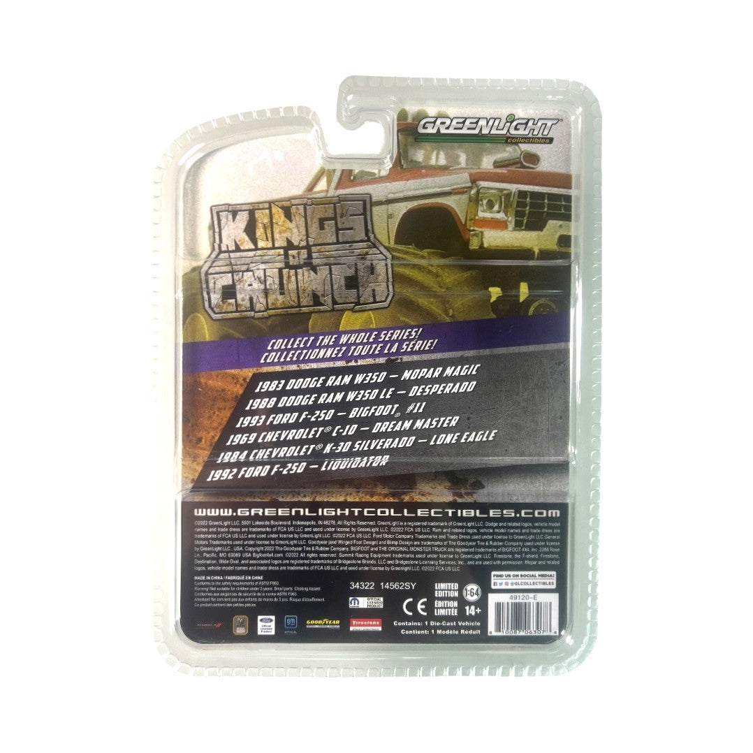 Bring the excitement of monster truck mayhem to your collection with the GreenLight - Kings Of Crunch 1984 Chevrolet K-30 Silverado Lone Eagle in 1:64 scale! This mini powerhouse features bold details and a rugged look, perfect for playful races or showing off on your shelf. Ready to roar, roll, and crunch its way into your heart!